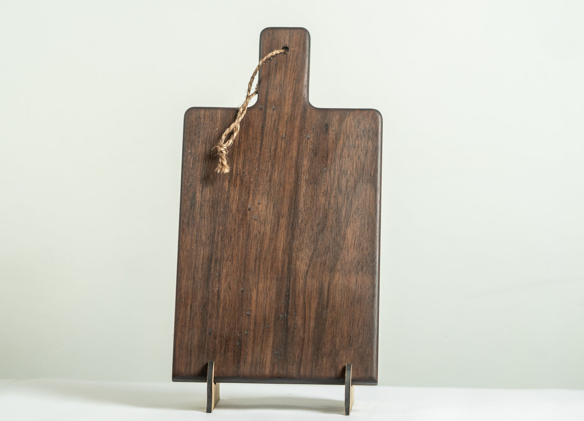 Clásica tabla de cortar o presentar picada. Realizada en madera Nogal. Hecha de forma artesanal. Construida en una sola pieza. Excelentes terminaciones. Protegida con cera natural totalmente apta para contactos con alimentos.